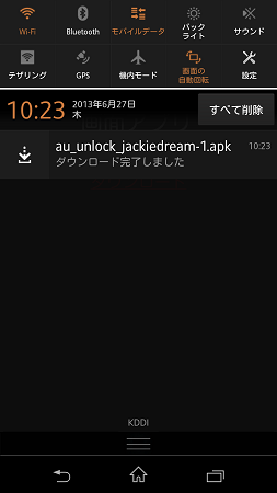 ②端末上部からステータスバーを下ろします。その中にロック解除アプリがダウンロードされましたという通知が来ています。通知をタッチ。
